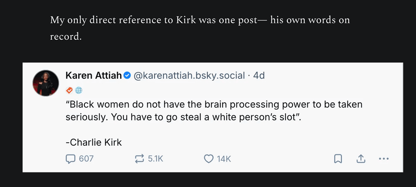 It wasn’t only politicians. MSNBC and the Washington Post have fired pundits and journalists who expressed honest assessments of the situation, and according to Drop Site News, at least 60 regular Americans face similar consequences for their uncouth speech. Comcast, the company who fired MSNBC’s Matthew Dowd, sent a company-wide email eulogizing Kirk and praising him as an “advocate for open debate.” In the unintentionally ironic email, the company said: